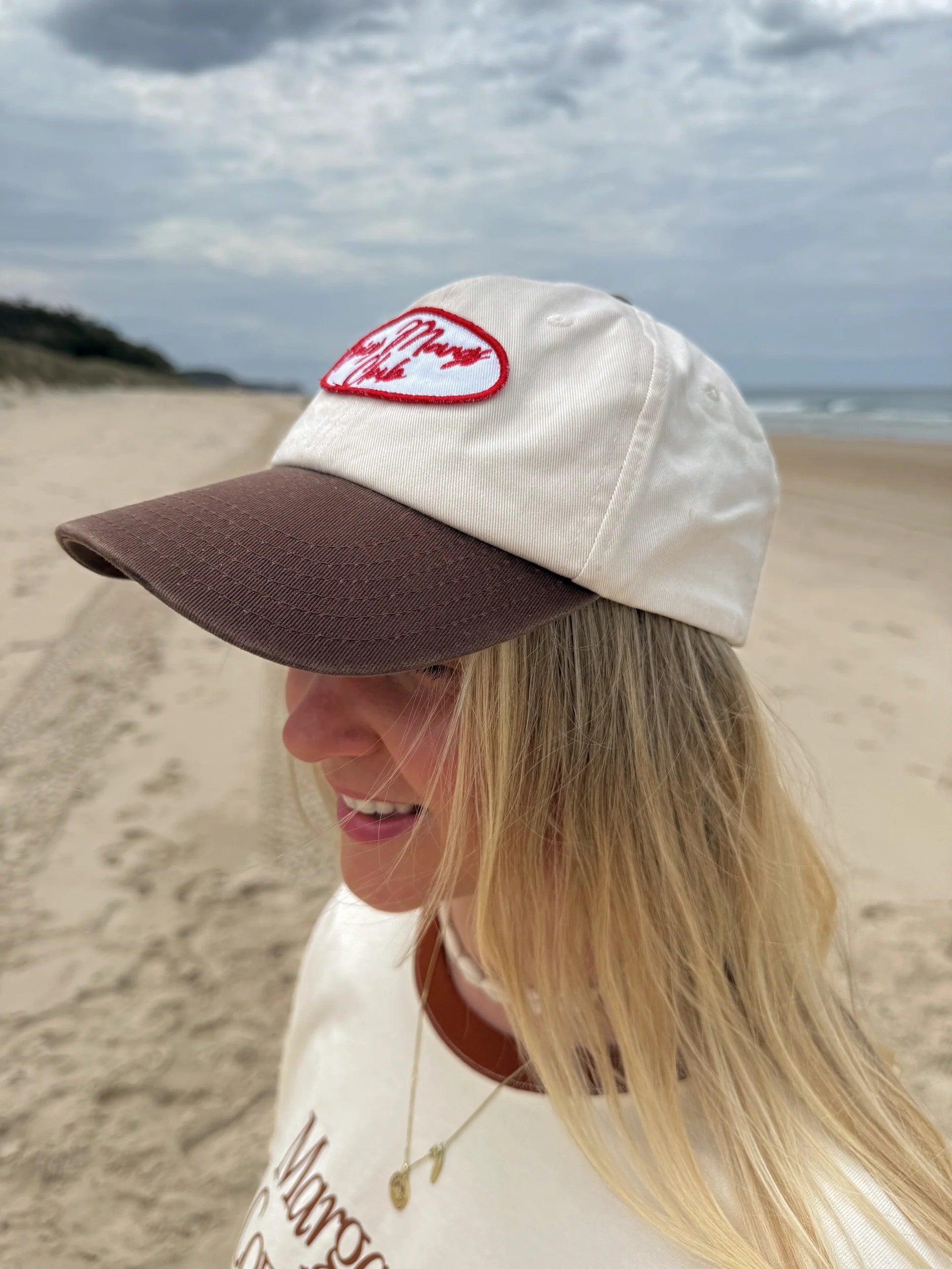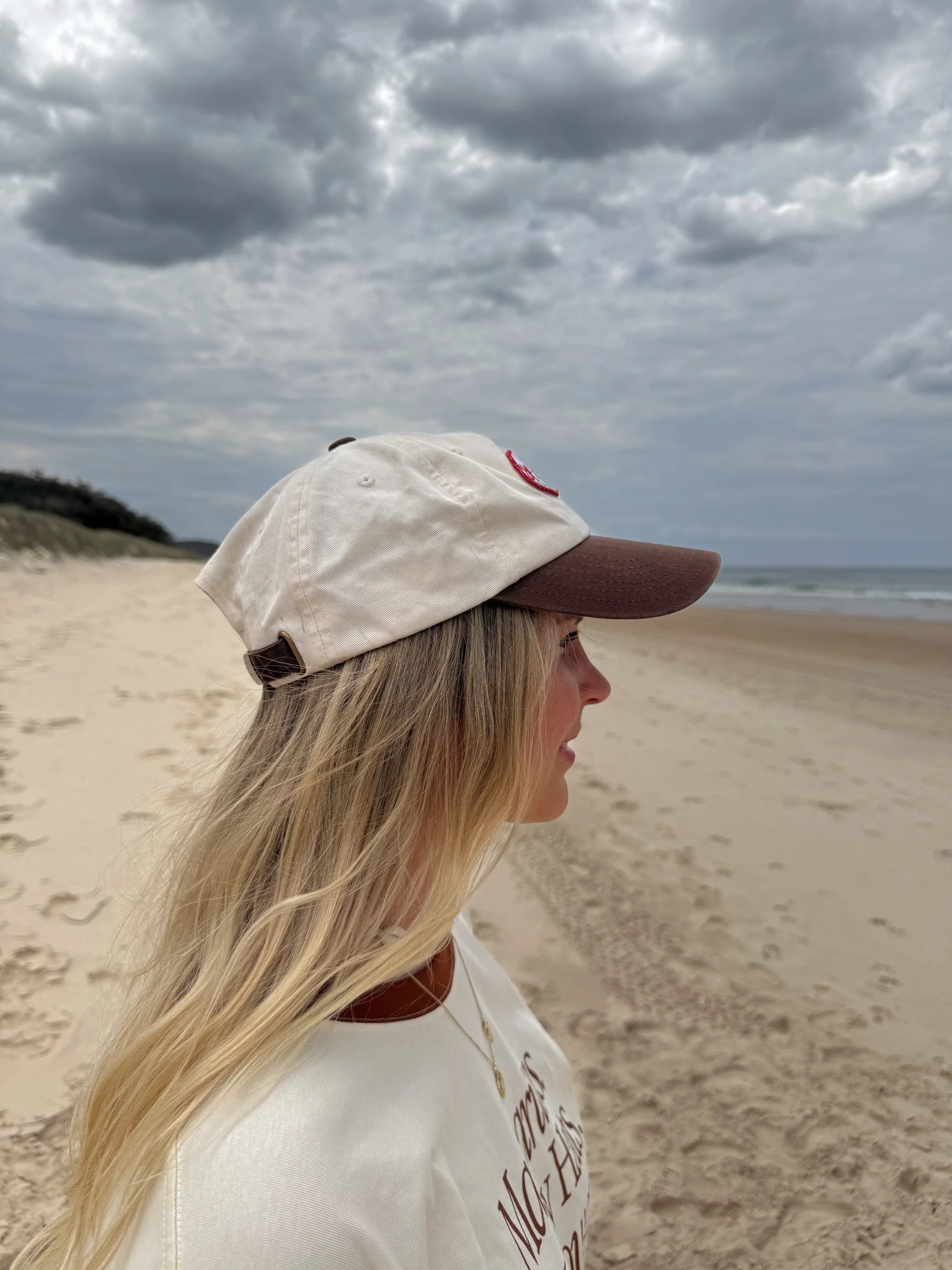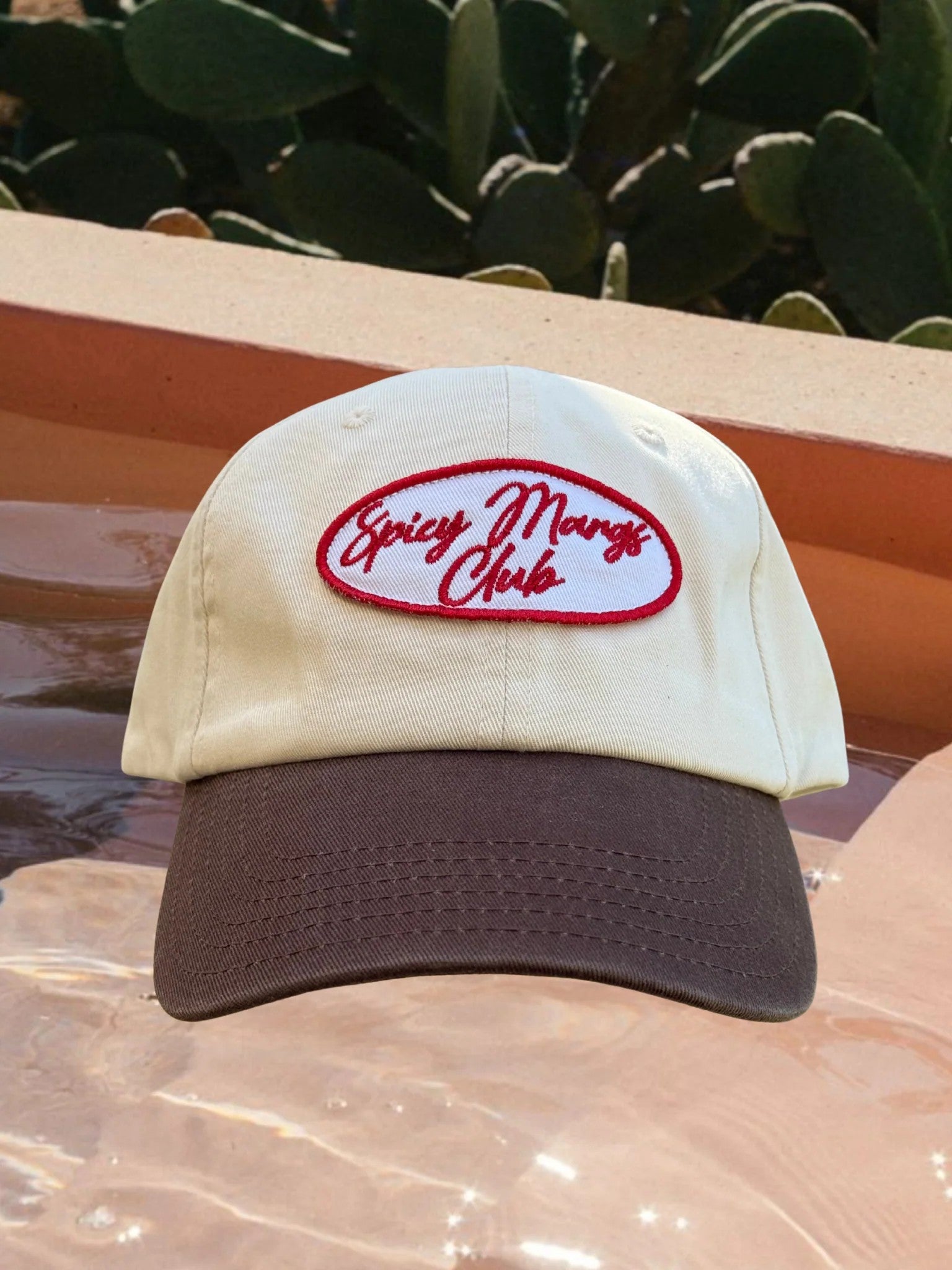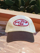 Life's too short for boring accessories. This dad cap is your ticket to good vibes only — crafted from 100% organic cotton in a fresh brown and cream colour way with a bold red embroidered patch front and centre. Spicy!