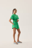 The Cruise Terry Short in Tropical Green, is crafted from a jacquard terry towelling fabric, inspired by endless summer days at the beach. With an elastic waistband for comfort, and side pockets for practicality, wear yours with our matching Cruise Terry Top in Tropical Green, or Dolphine Tank in French Blue for the ideal combination of comfort and style.