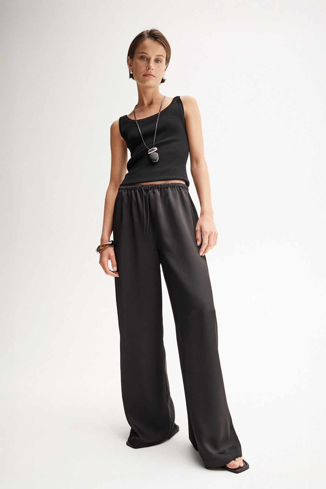 Exploring new iterations of elevated essentials, the Mina becomes a new go-to for mid season dressing. Made of a luxe silky fabric with smooth handful and effortless drape, these pants are cut to a full length silhouette with wide leg and gathered waistband with a drawstring for comfortable wear. Style with a basic tank and your favourite accessories, perfect for any occasion.