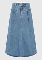 In mid-weight cotton denim, the Jacque Skirt offers effortless wear with a fly front closure and sleek jet pockets. A back yoke and pintuck details shape the A-line silhouette, while the midi length makes it a versatile wardrobe staple.