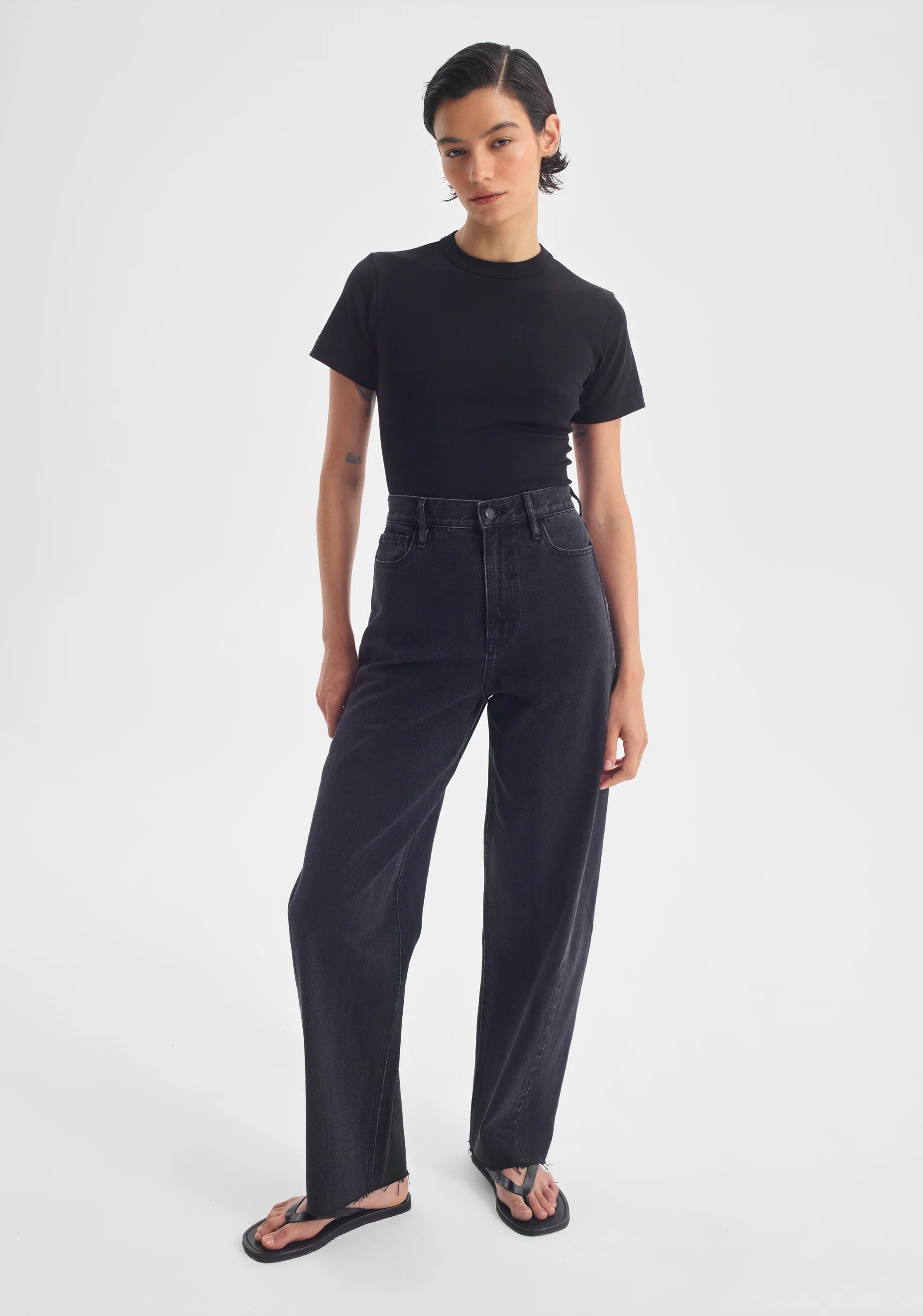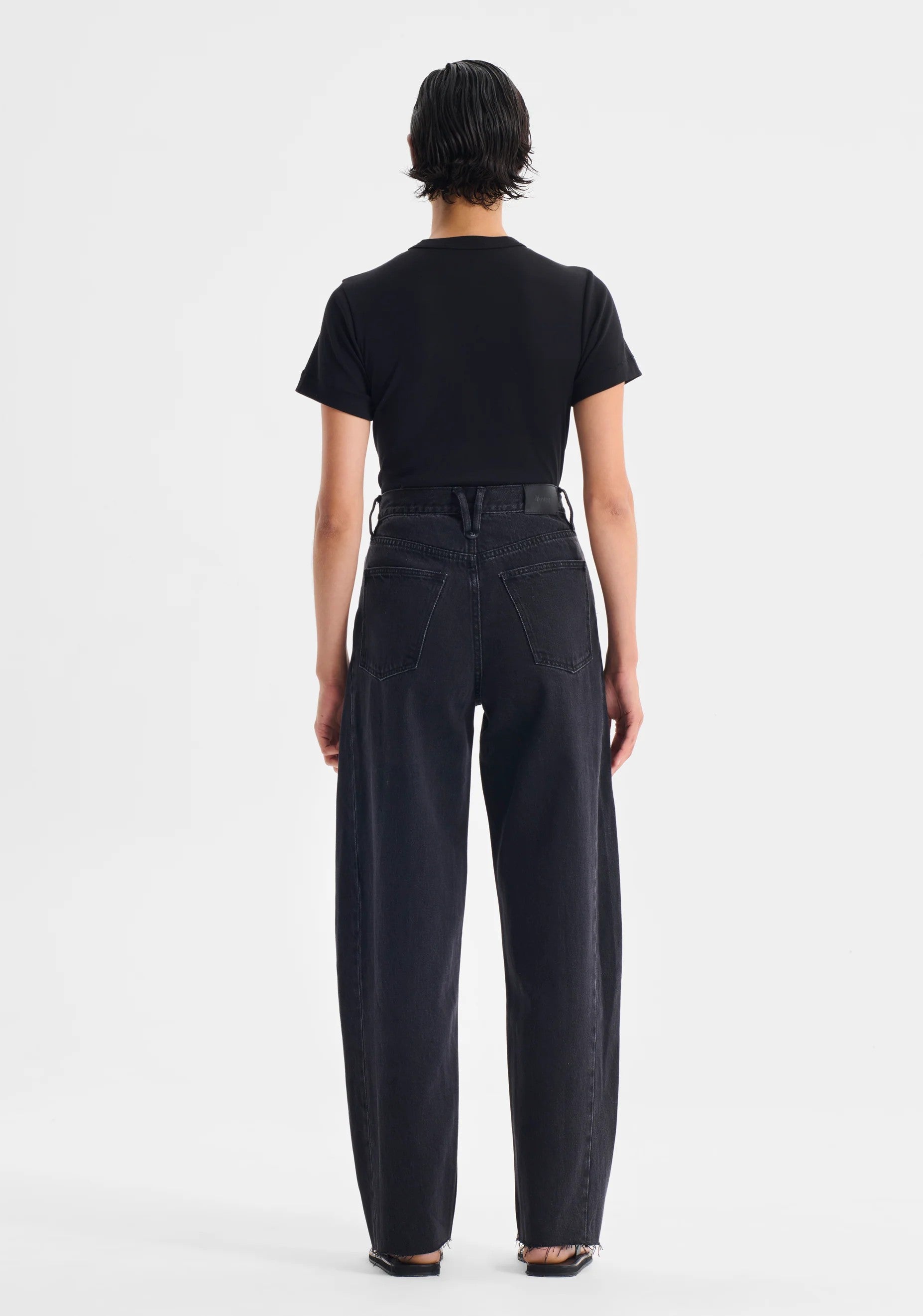 Crafted from mid-weight cotton denim, the Arley Jean features a high-rise waist and classic five-pocket design. A side leg panel, barrel leg silhouette, and raw hem finish complete this full-length style with a modern feel.