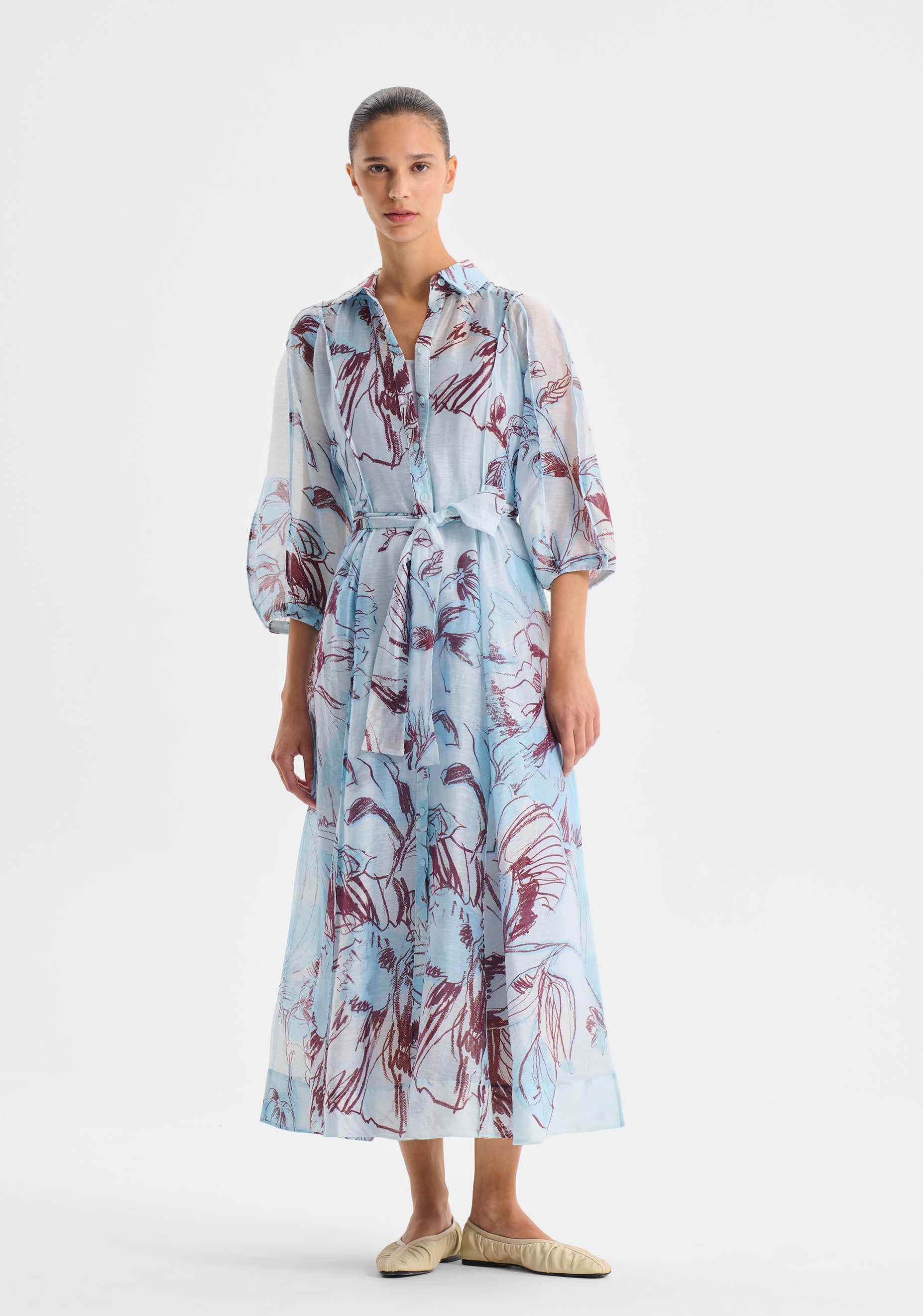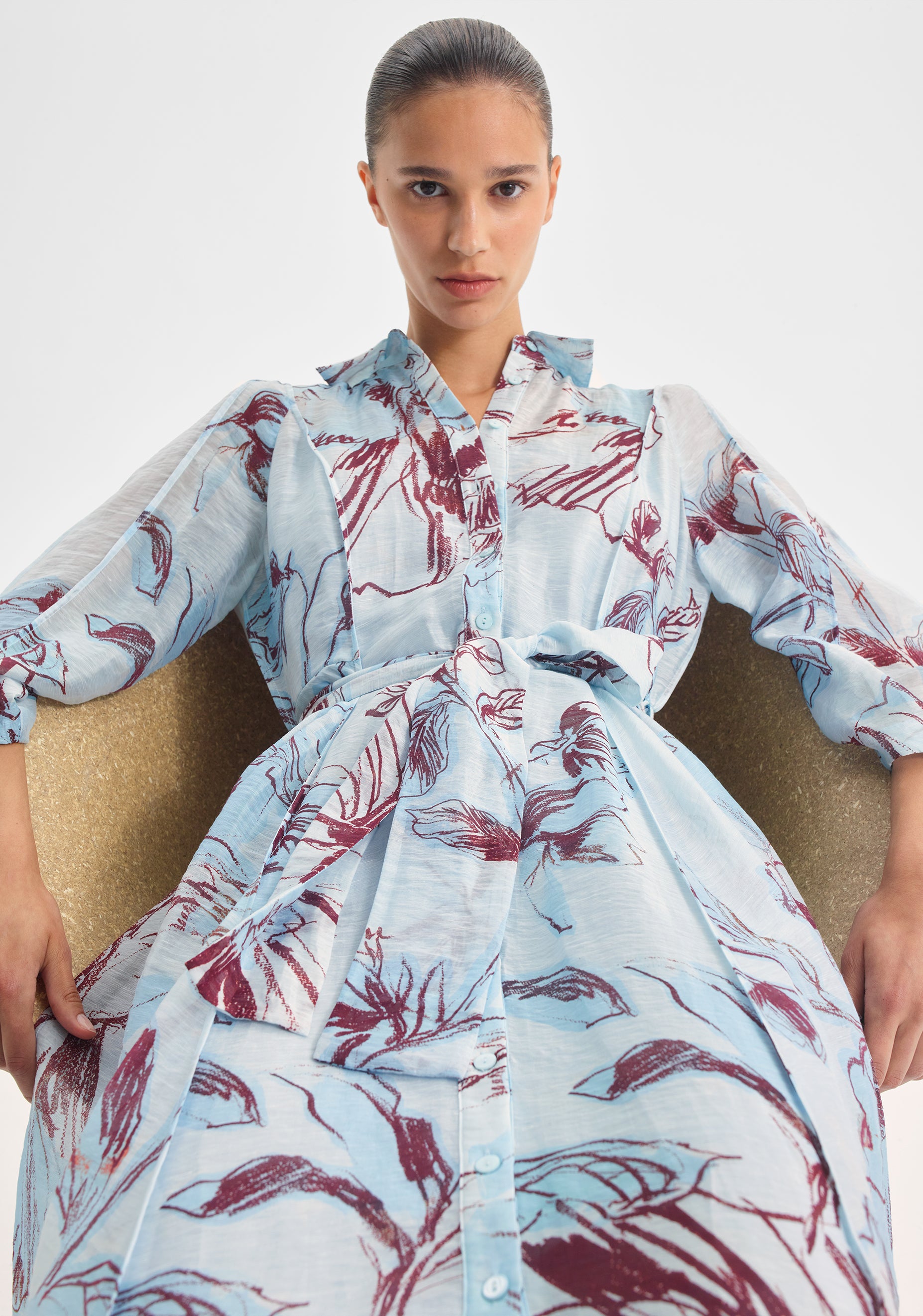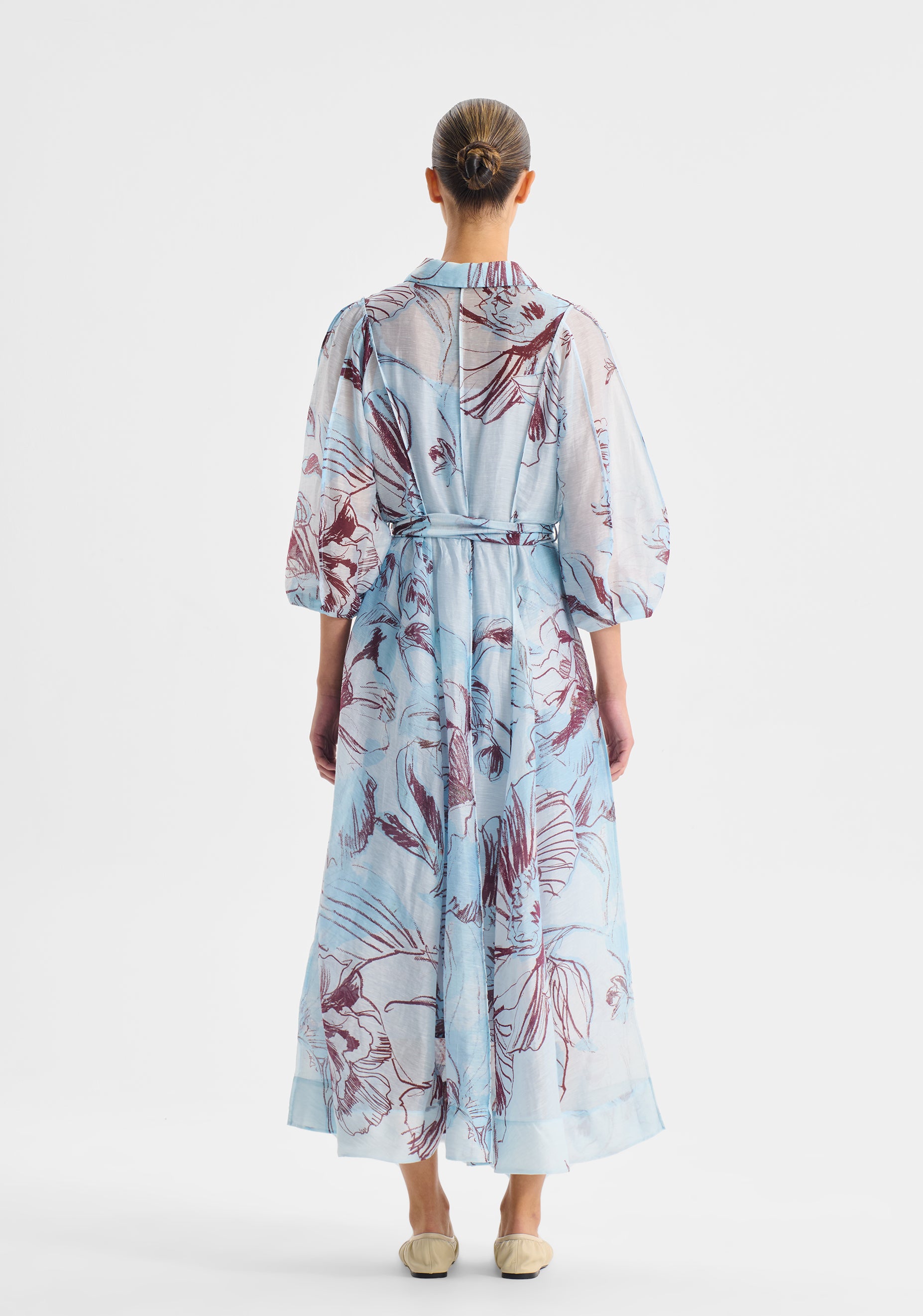 Crafted from a textured semi-sheer linen blend in Morrison’s exclusive print, the Mae Shirt Dress features a traditional collar, button front placket, and 3/4 panelled sleeves. Designed with pintuck detailing throughout, it fits neatly at the waist before falling to a full swing maxi skirt.