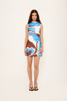 Meet your new statement mini. The Cielo Blue Abstract Mesh Mini Dress is crafted from a soft stretch mesh that hugs in all the right places, featuring a high neckline, ruched waist detailing, and a bold abstract print in sky blue, chocolate and ivory tones. Fully lined for comfort with just the right amount of stretch, this mini takes you from day drinks to dance floor with ease.