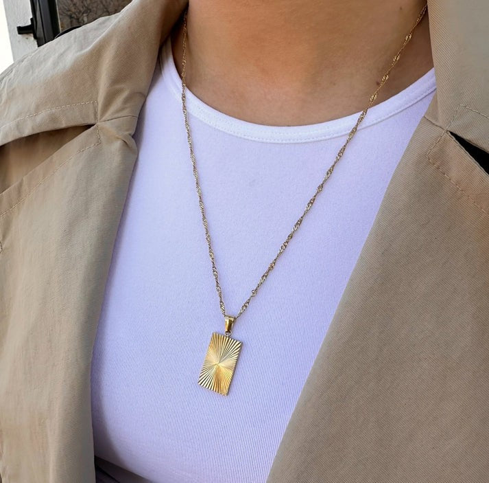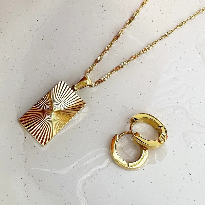 The geometric lines and detail in the gold Motion Pendant Necklace portrays a statement of chic elegance.
