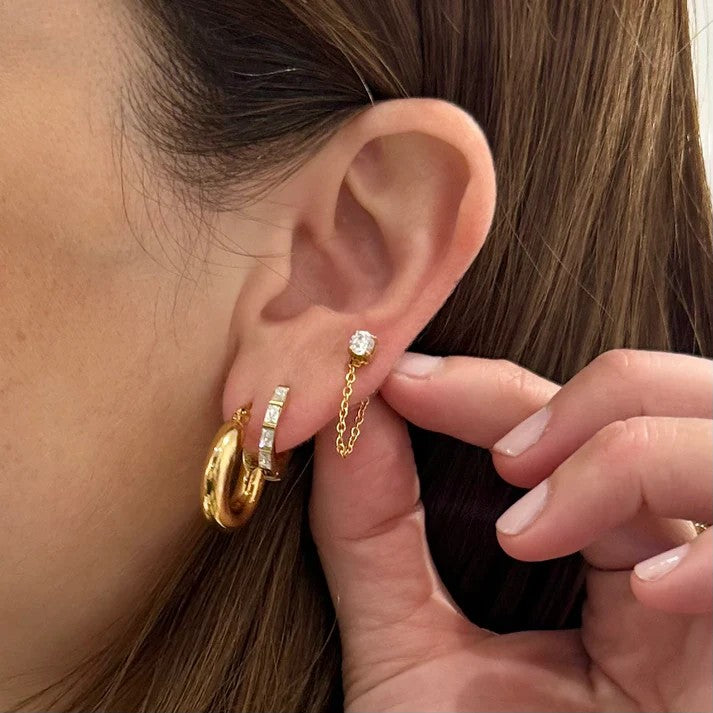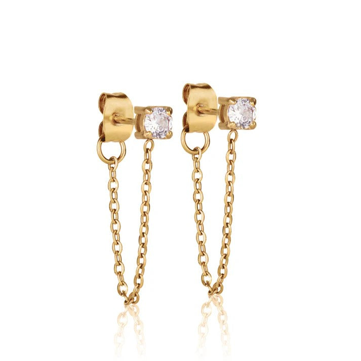 This studded design features a delicate drop chain which is connected by a cubic zirconia crystal.