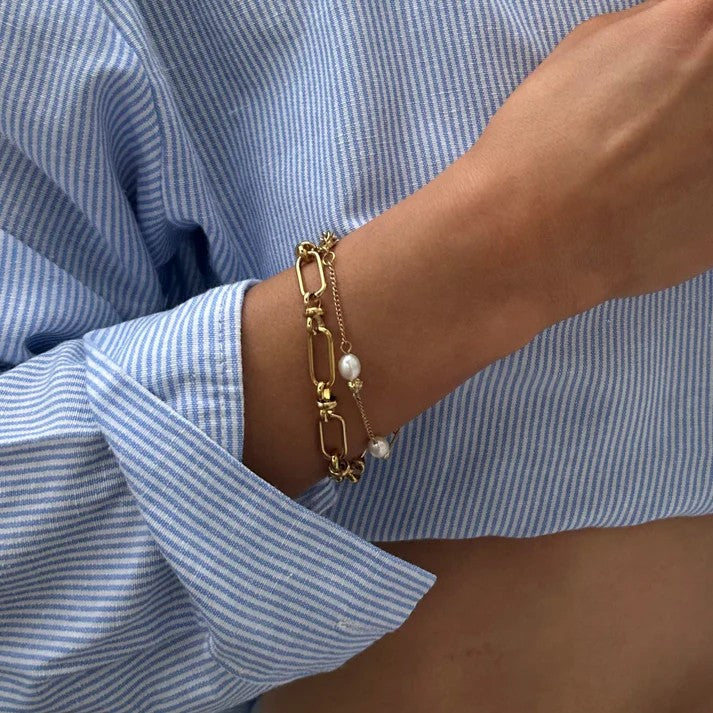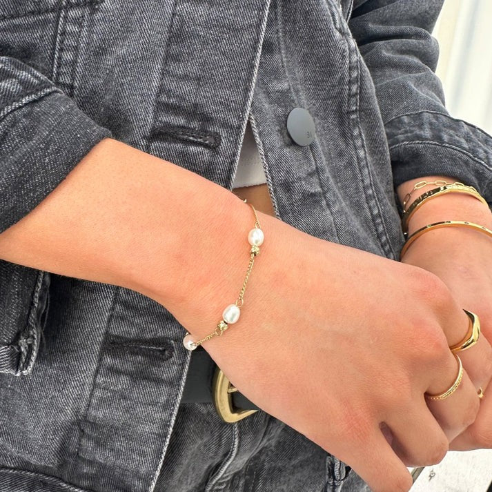 A refined twist on sporty elegance. The Off Court Pearl Bracelet features a delicate rope chain spaced with four freshwater pearls and hammered golden balls ~ polished, subtle, and made to move with you.