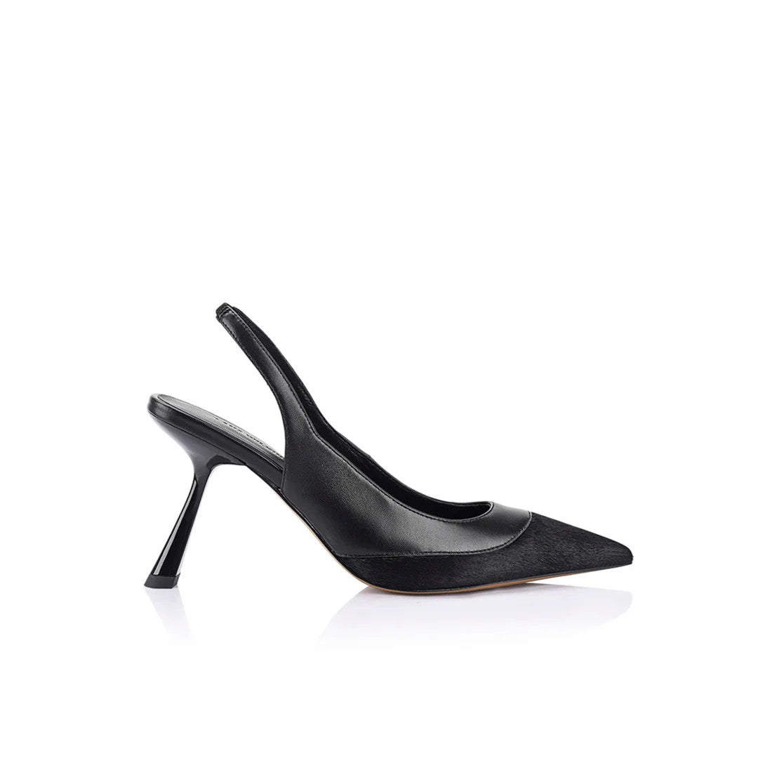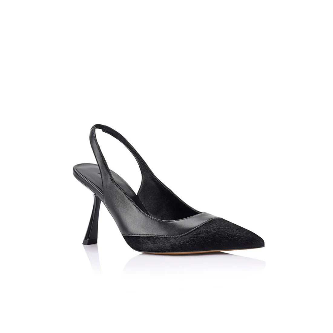 Celeste embodies understated glamour with a touch of edge. Designed in a striking black tone, this pointed-toe slingback is expertly crafted from smooth leather and finished with textured calf hair toe. The sculptural stiletto heel adds an architectural elegance, while the elasticated slingback strap ensures a secure, flattering fit.