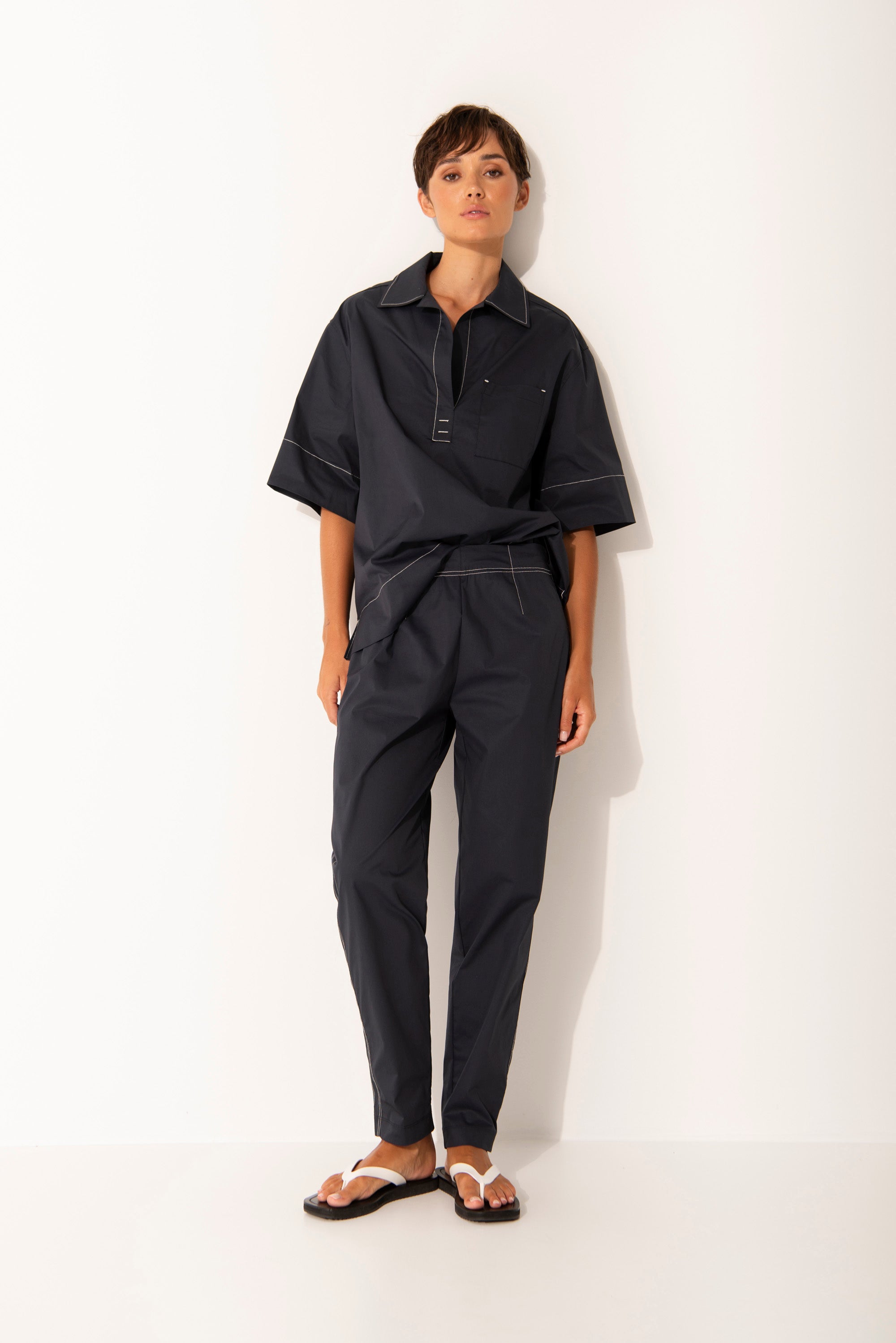 Experience effortless style with these slim leg capri pants crafted from crisp cotton stretch fabric. Featuring a flattering 7/8 length and contrast topstitch detailing, they offer a modern, tailored look. The elasticised back waist and easy pull-on design ensure comfort and convenience, while jetted pockets add a sleek finish. Perfect for a polished yet relaxed wardrobe update.