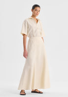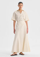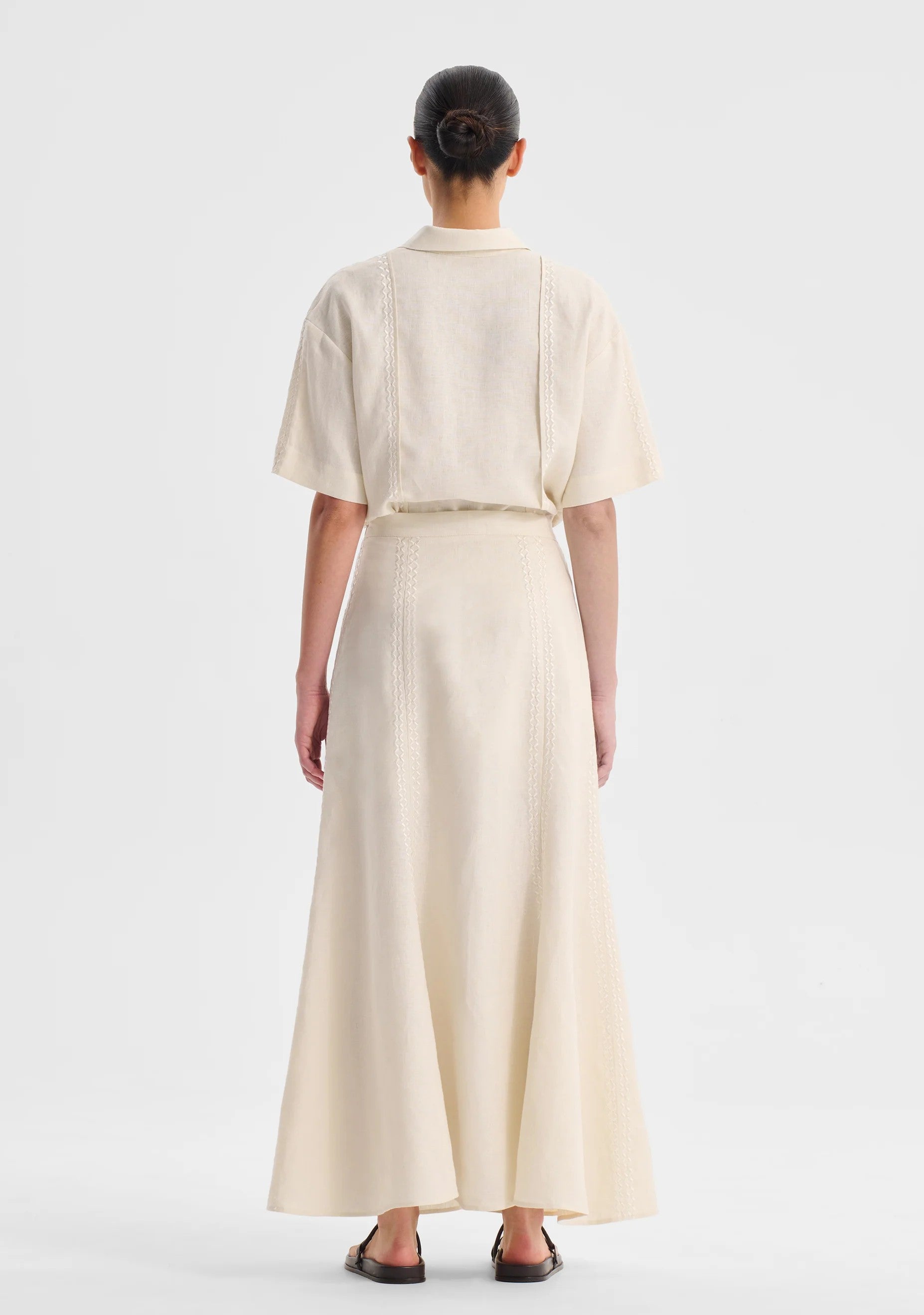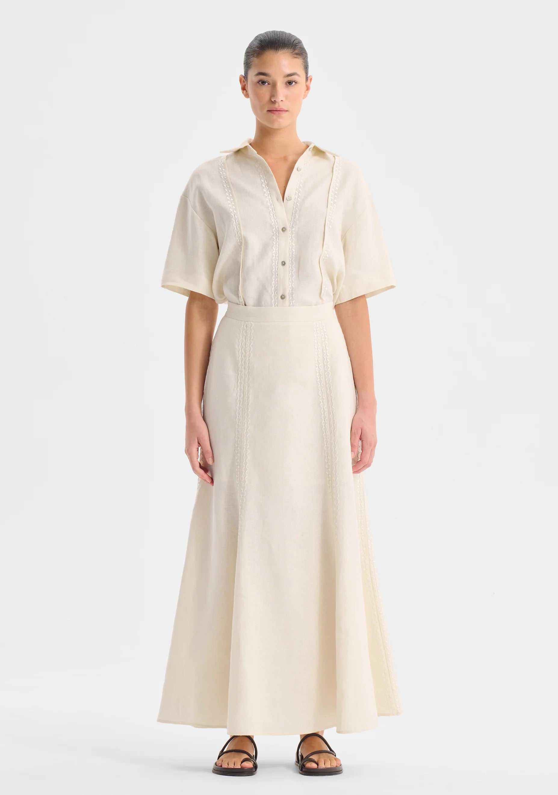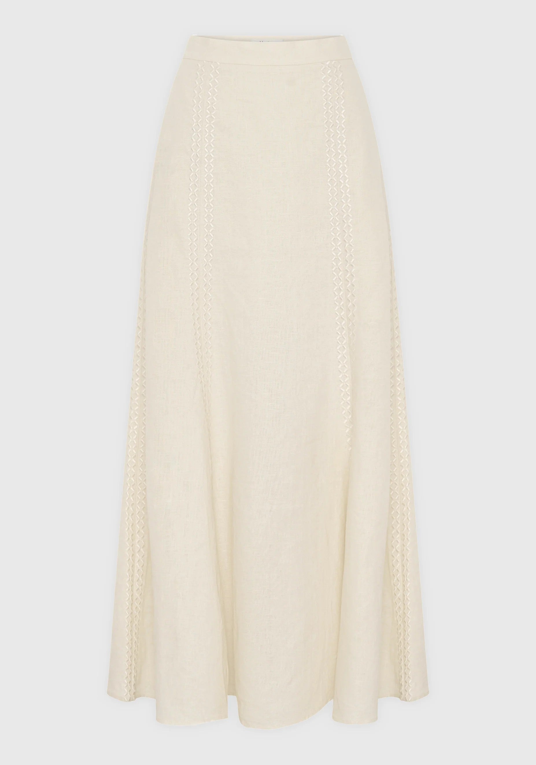 Crafted from premium mid-weight linen with an exclusive embroidery design, the Maisey Skirt features a flared silhouette and an invisible side zip for a seamless finish. Cut to a maxi length and fully lined in cotton, it combines comfort with effortless elegance.