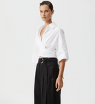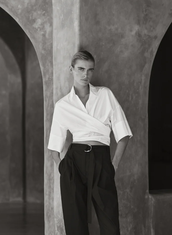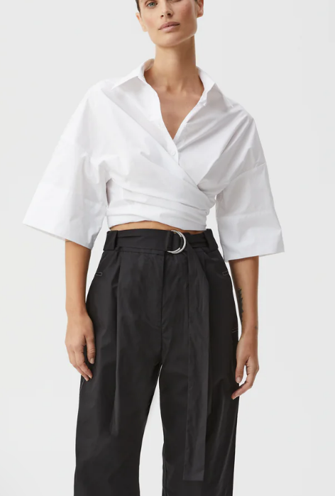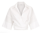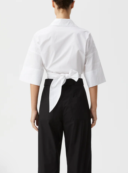100% Cotton, Mid weight cotton poplin, Traditional Collar, Button front placket, Drop shoulder, Short sleeve, Wide faced cuff, Functional wrap ties to back or side at waist.