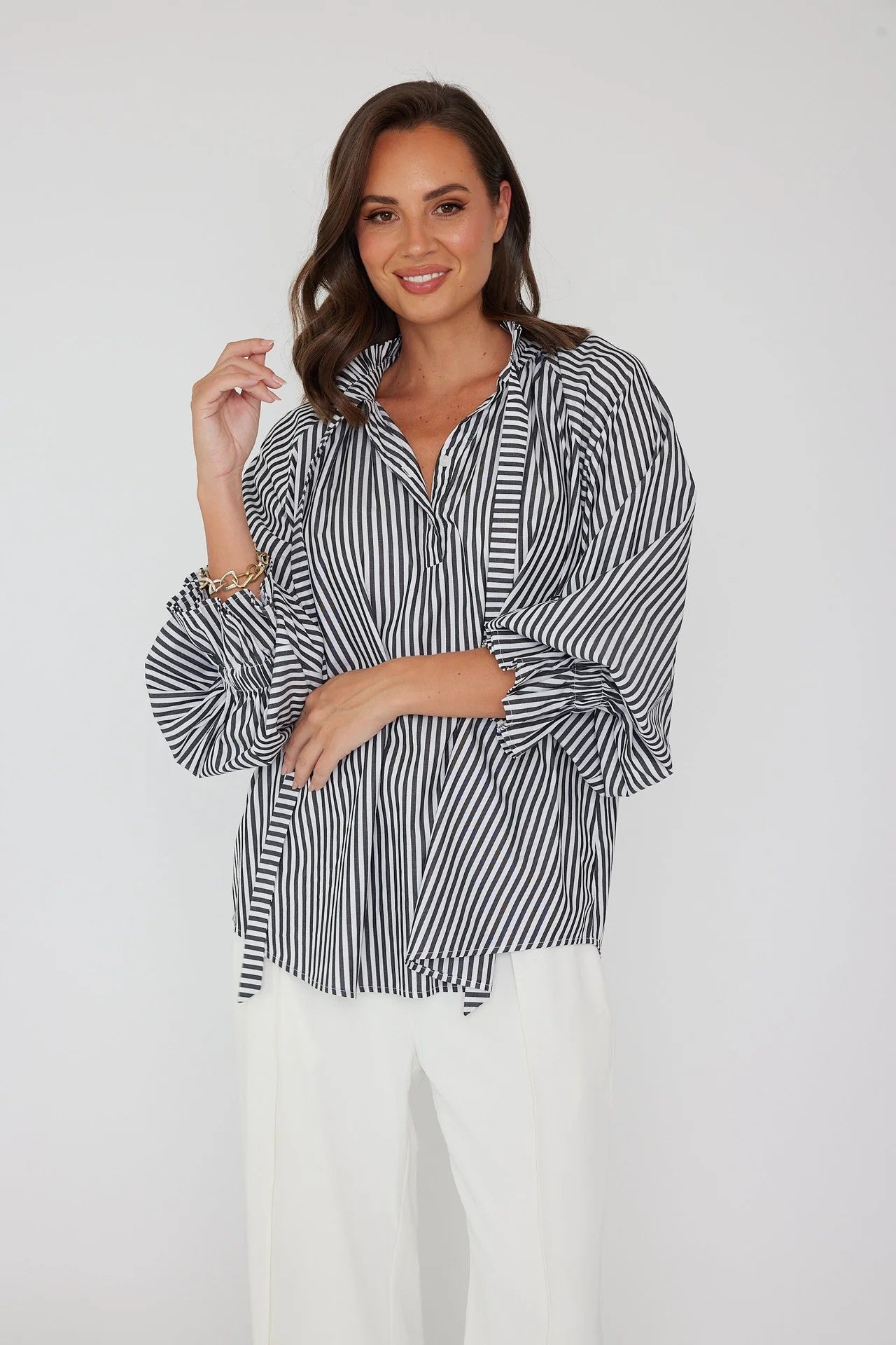 The DANILL blouse is crafted in fluid drapes that effortlessly rest over the frame. This ethereal blouse is imbued with a nonchalant appeal with tie-up neck straps, scooped hem, and stunning back pleats. Elasticated cuffs and a button-up front give off that classic appeal. It's perfectly finished with frilled cuffs.