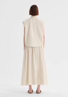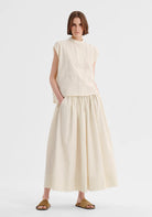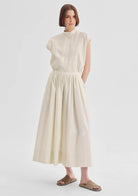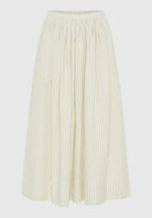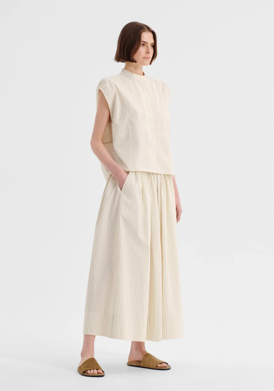 The Evie Skirt is crafted from striped cotton poplin and designed with a narrow waistband, elastic through the back, and soft gathers at the waist. Finished with slant pockets, an invisible side zip, and a faced hem, it falls into a full swing silhouette at a midi length.