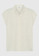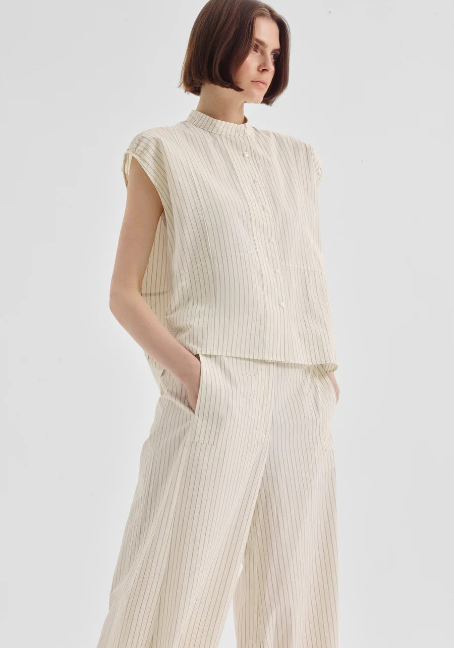 The Evie Top is crafted from crisp cotton poplin and features a stand collar, sleeveless cut, and button-front opening. A panelled body adds subtle structure, while the relaxed fit keeps the silhouette effortless.