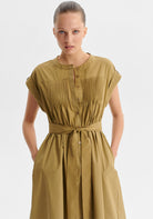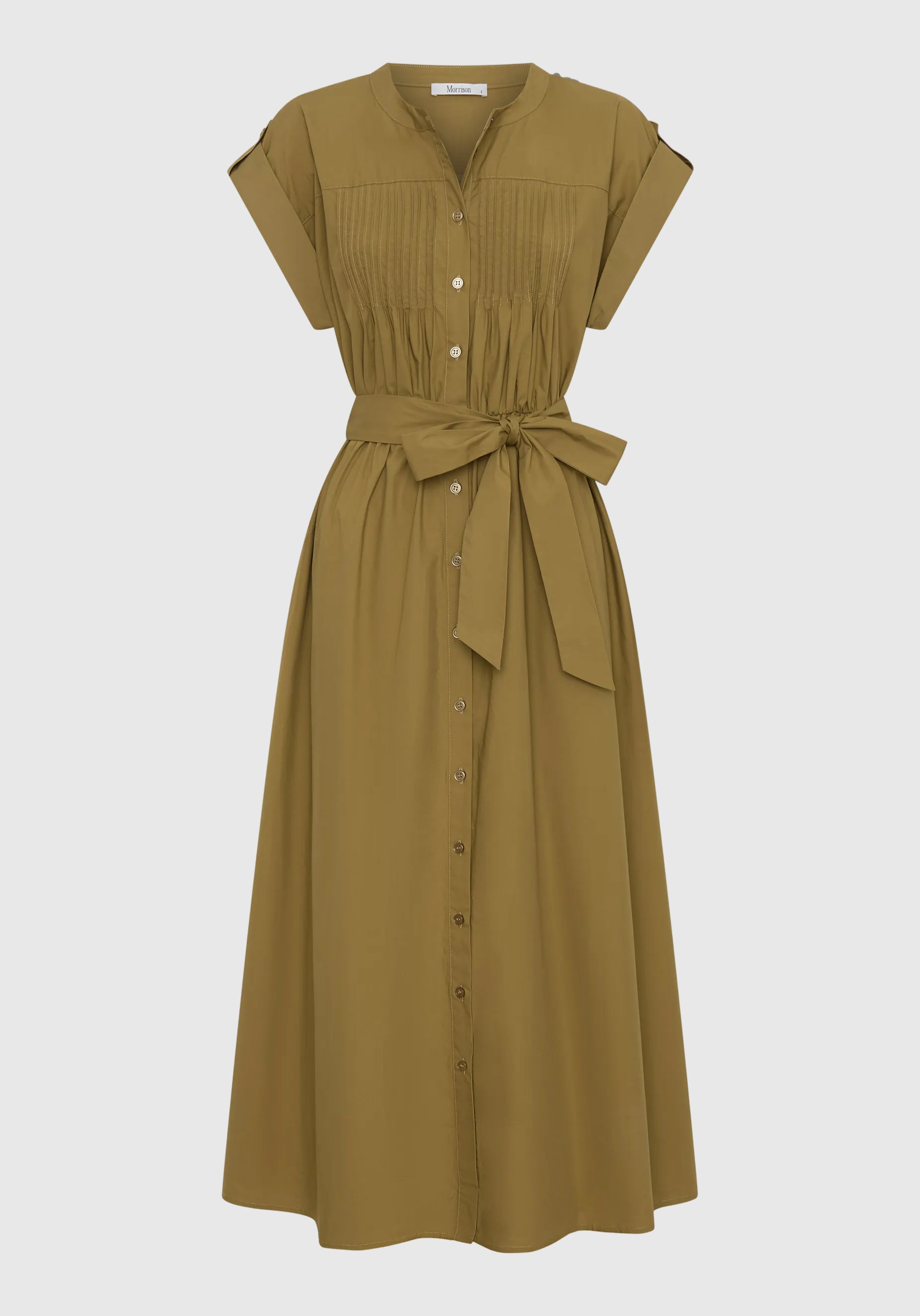 The Romy Shirt Dress is crafted from midweight cotton poplin, designed with delicate pintuck detailing at the front and a classic button-front closure. Cuffed sleeves with button tabs and a lightly elasticised waist create a flattering shape, complemented by in-seam pockets for practicality. The A-line skirt falls to a midi length, finished with a self-fabric waist belt for an effortlessly polished look.