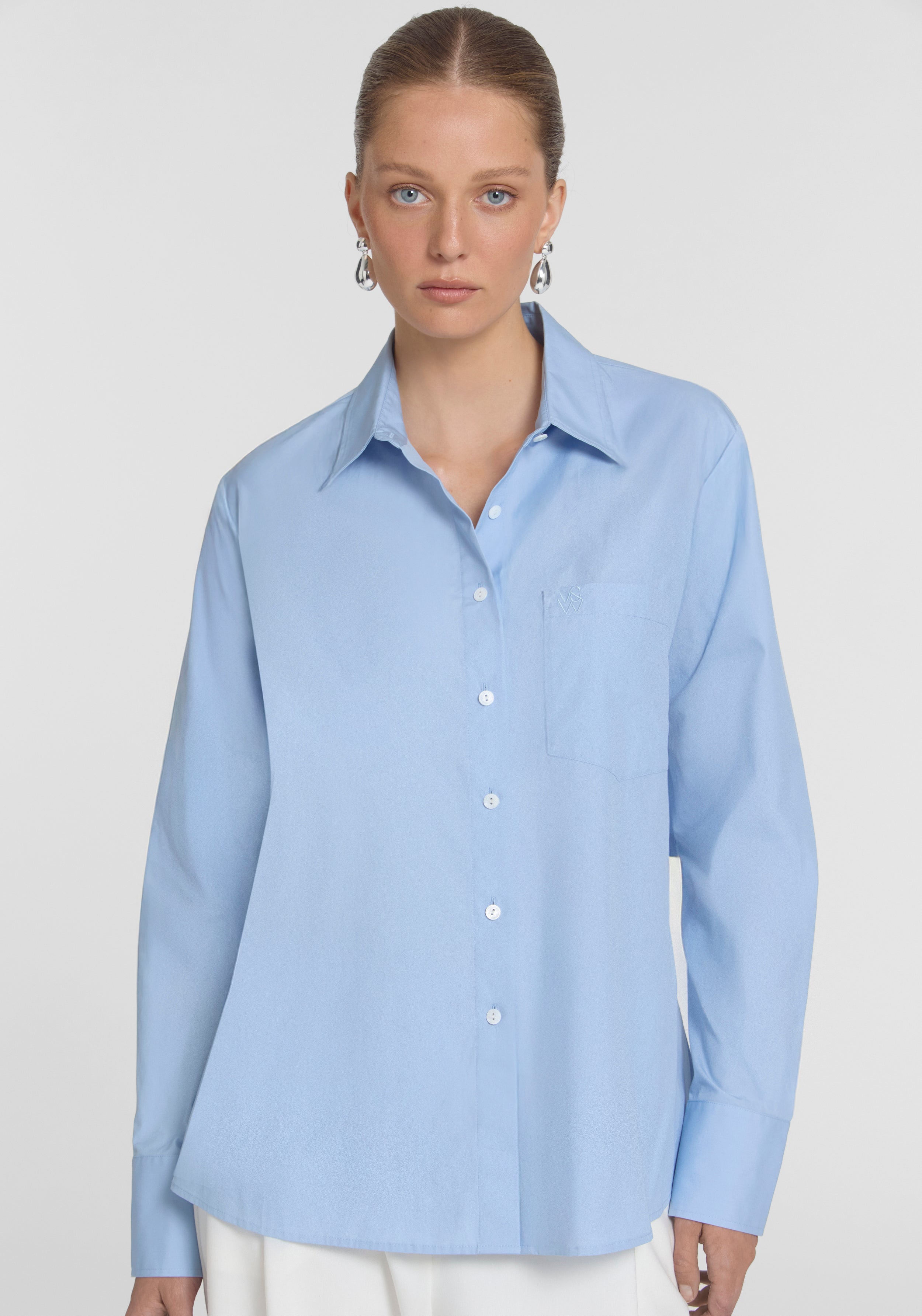 An essential investment for the modern wardrobe, the Divinity Shirt is crafted from crisp organic cotton in a summer blue hue. Designed with a classic collar and placket, relaxed shoulders, and a longline silhouette, it offers details that matter, a storm-flap back with cut-out and drawstring, logo buttons, and V&W embroidery. Style with the Idol Pant or Fenton Short in the matching hue for relaxed executive presence.