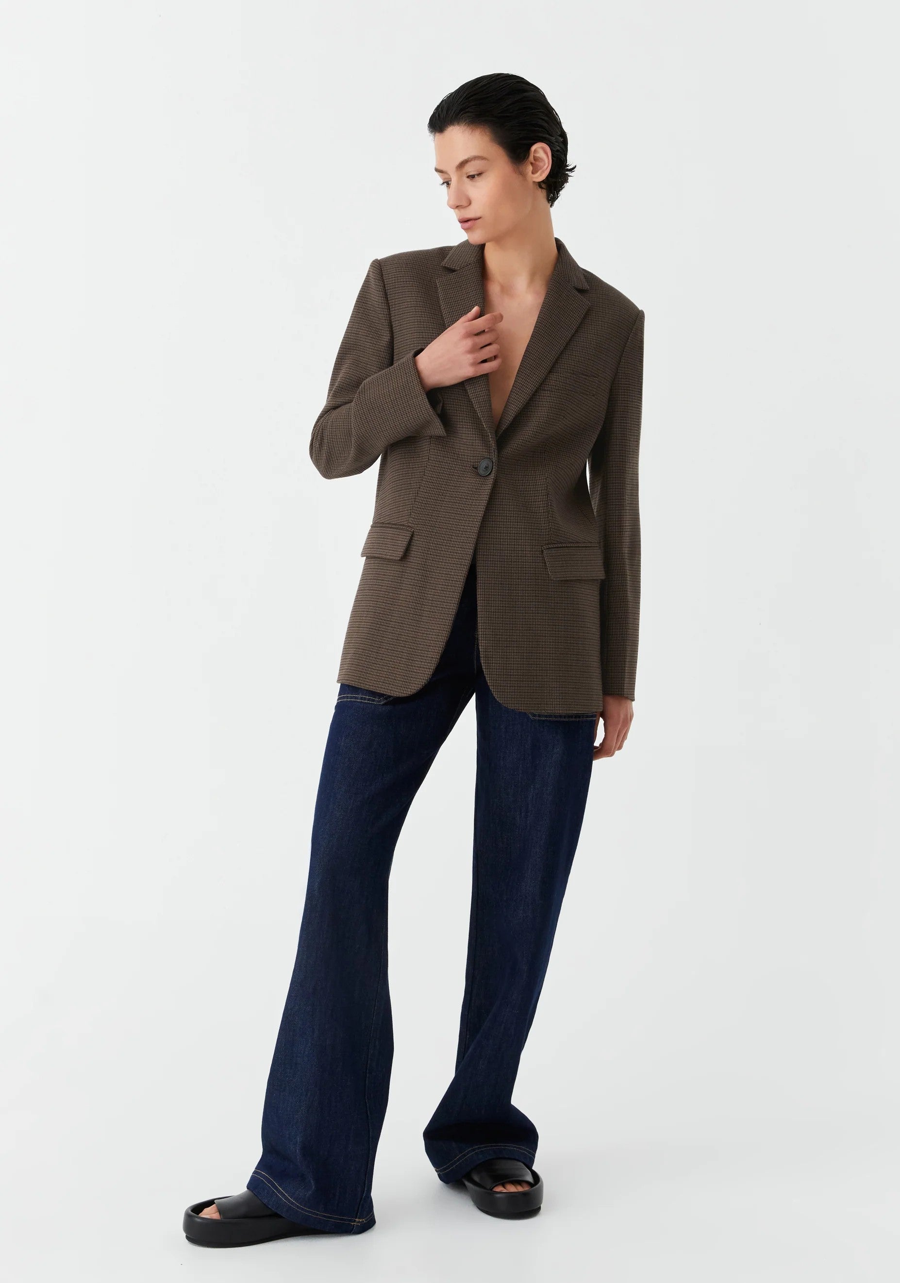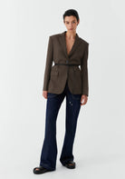 The Emmet Blazer in Houndstooth is tailored from a premium wool blend suiting with a classic houndstooth pattern. Designed with a structured peak lapel, vented sleeve cuffs, and front flap pockets, it also features a back hem vent for ease of movement. With a boxy fit and full lining, this blazer brings timeless tailoring to a modern silhouette.
