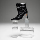 Introducing Matthew, the ultimate black boot update. Crafted from glossy, textured leather with delicate ruching, this pointed-toe ankle boot features a slim stiletto heel, midi length and a pull-on asymmetrical upper—perfect for effortless day-to-night styling.