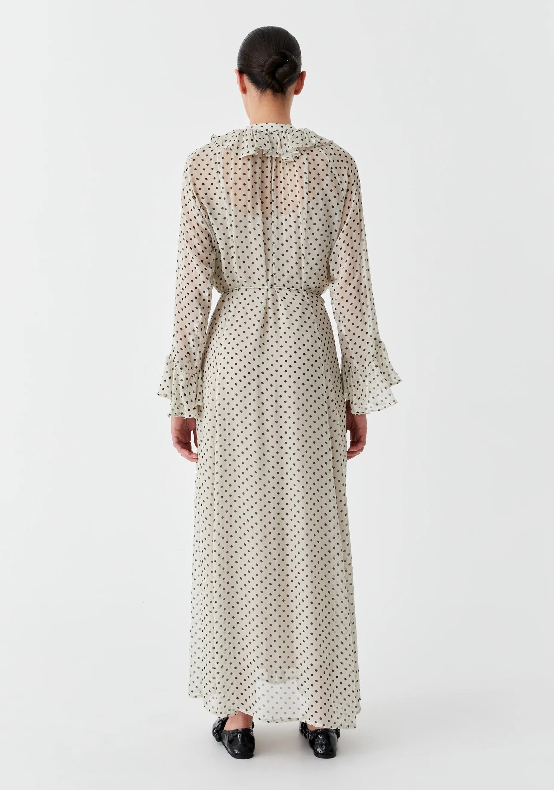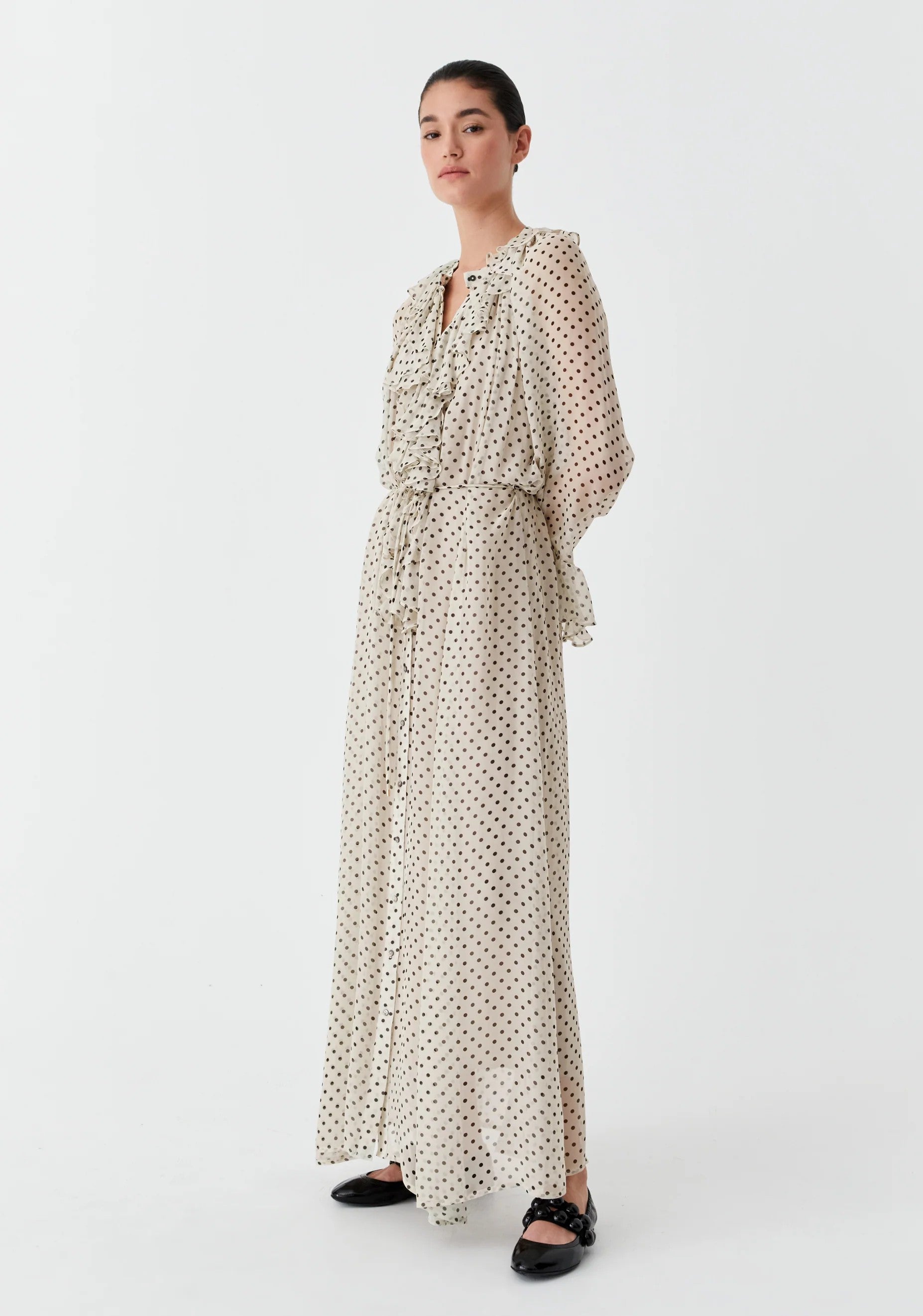 • Waterfall ruffle detail from neckline