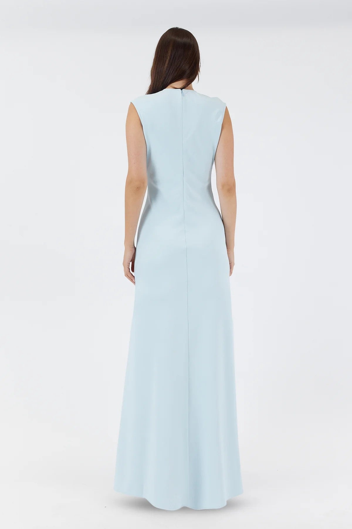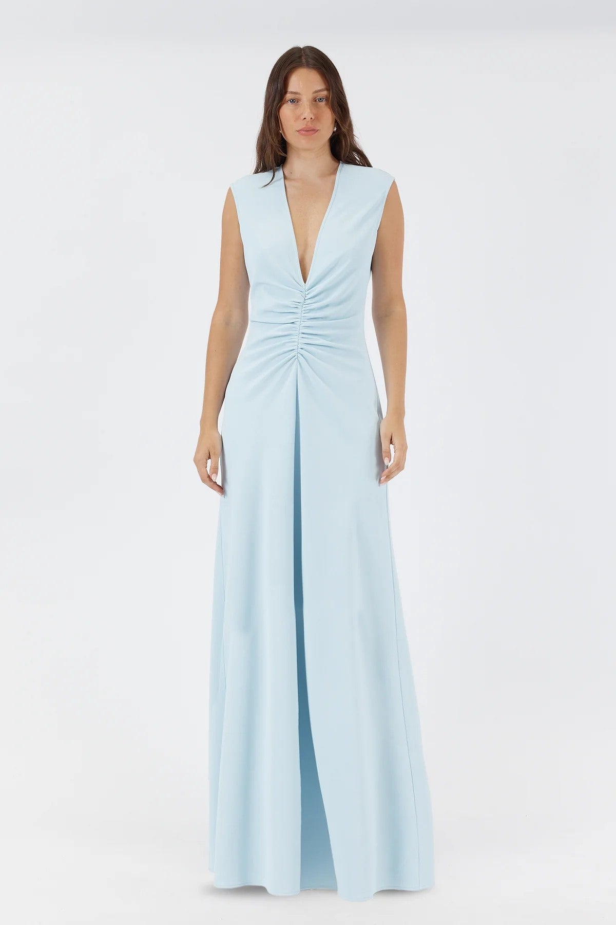 Crafted from luxurious polyester crepe, the Mara gown is fitted through the waist and hip giving a gentle hourglass silhouette. Elevated design details include V drop neckline and gathering across the centre front.
