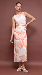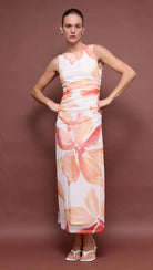 The Solana Orange & White Floral Mesh Midi Dress is a statement in soft structure and feminine design. Crafted from a lightweight mesh with a watercolour-inspired print, it features subtle side ruching to flatter the silhouette and a lined finish for comfort and ease.