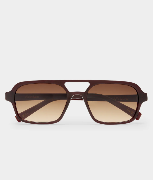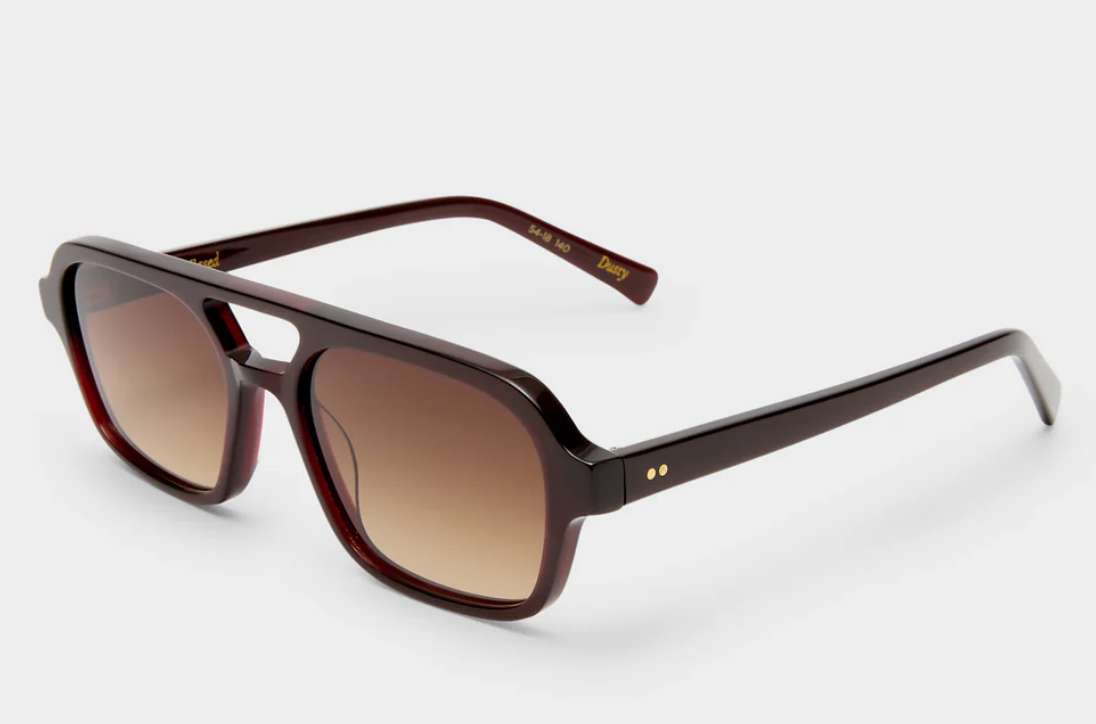 The Dusty is your true vintage aviator frame, large in structure but soft when shaping your face. Handcrafted with a deep red acetate and paired with a brown gradient lens. The style features subtle gold rivets on the outer arm temple and is a nod to the 70's era.