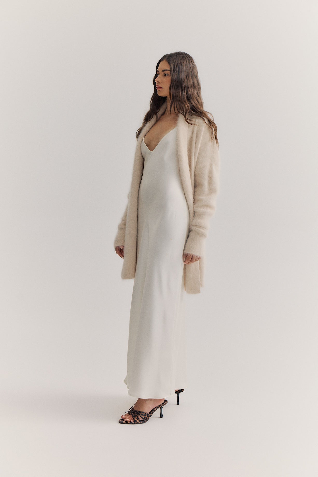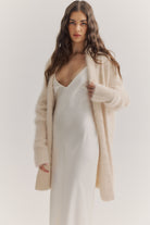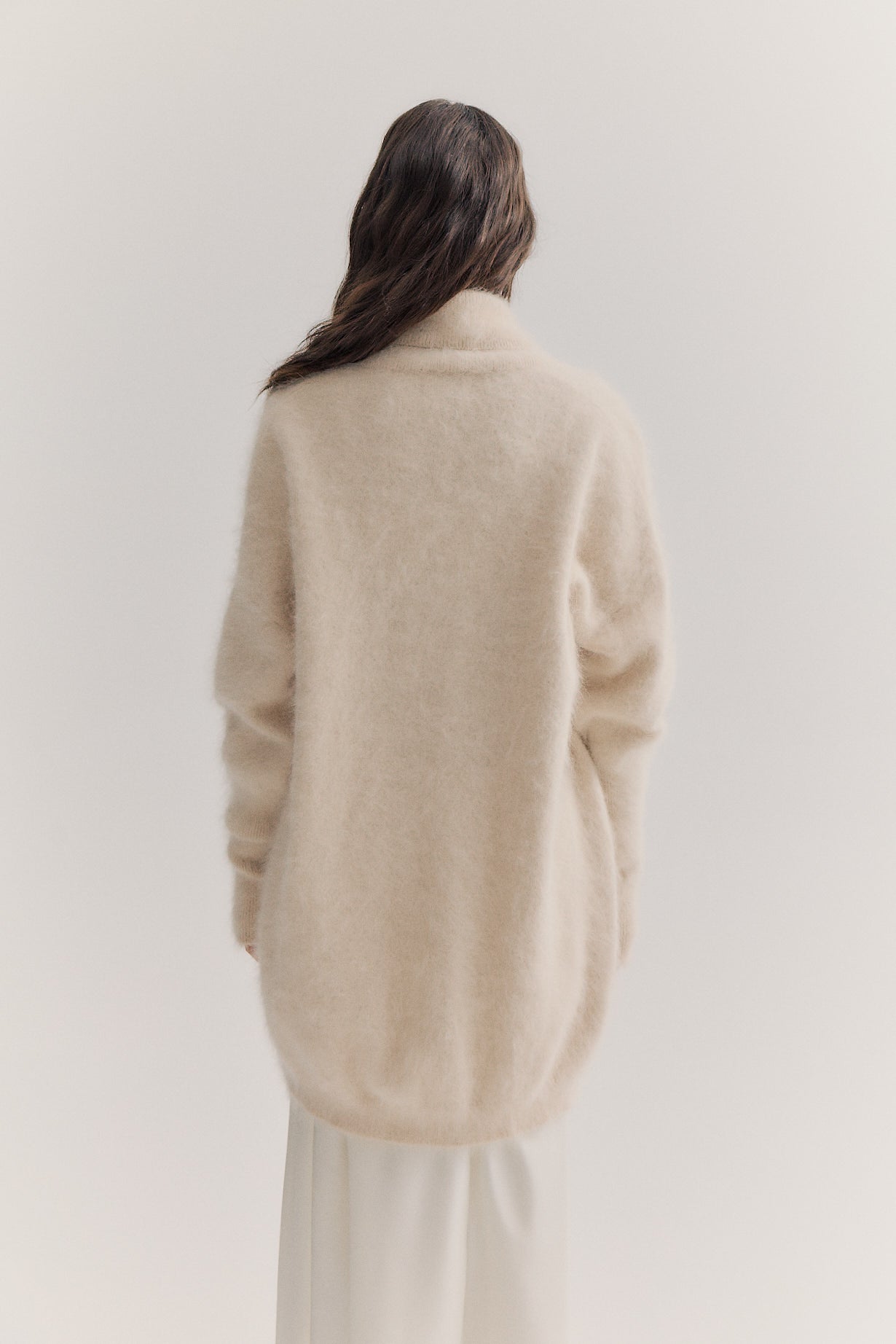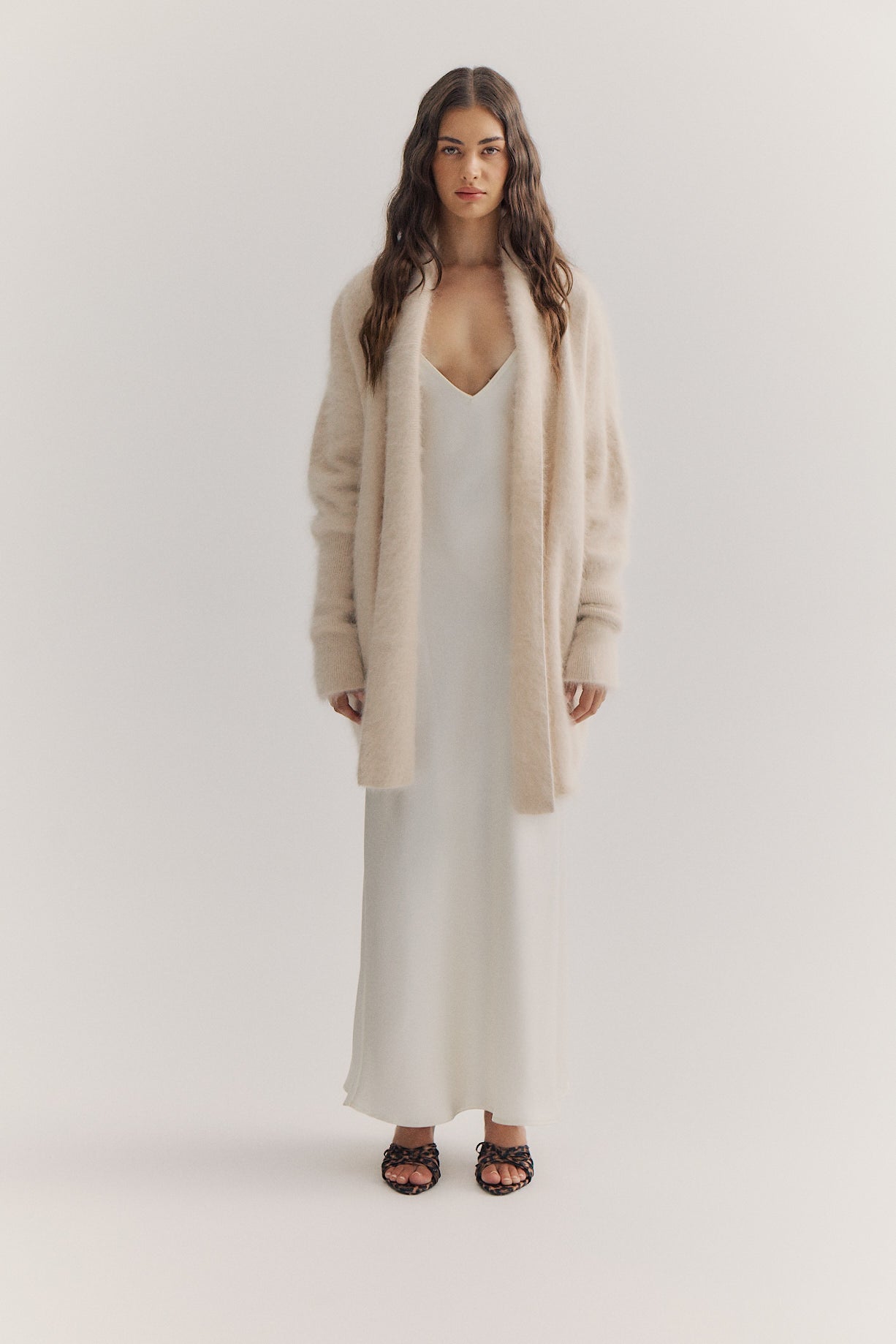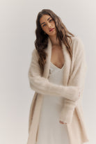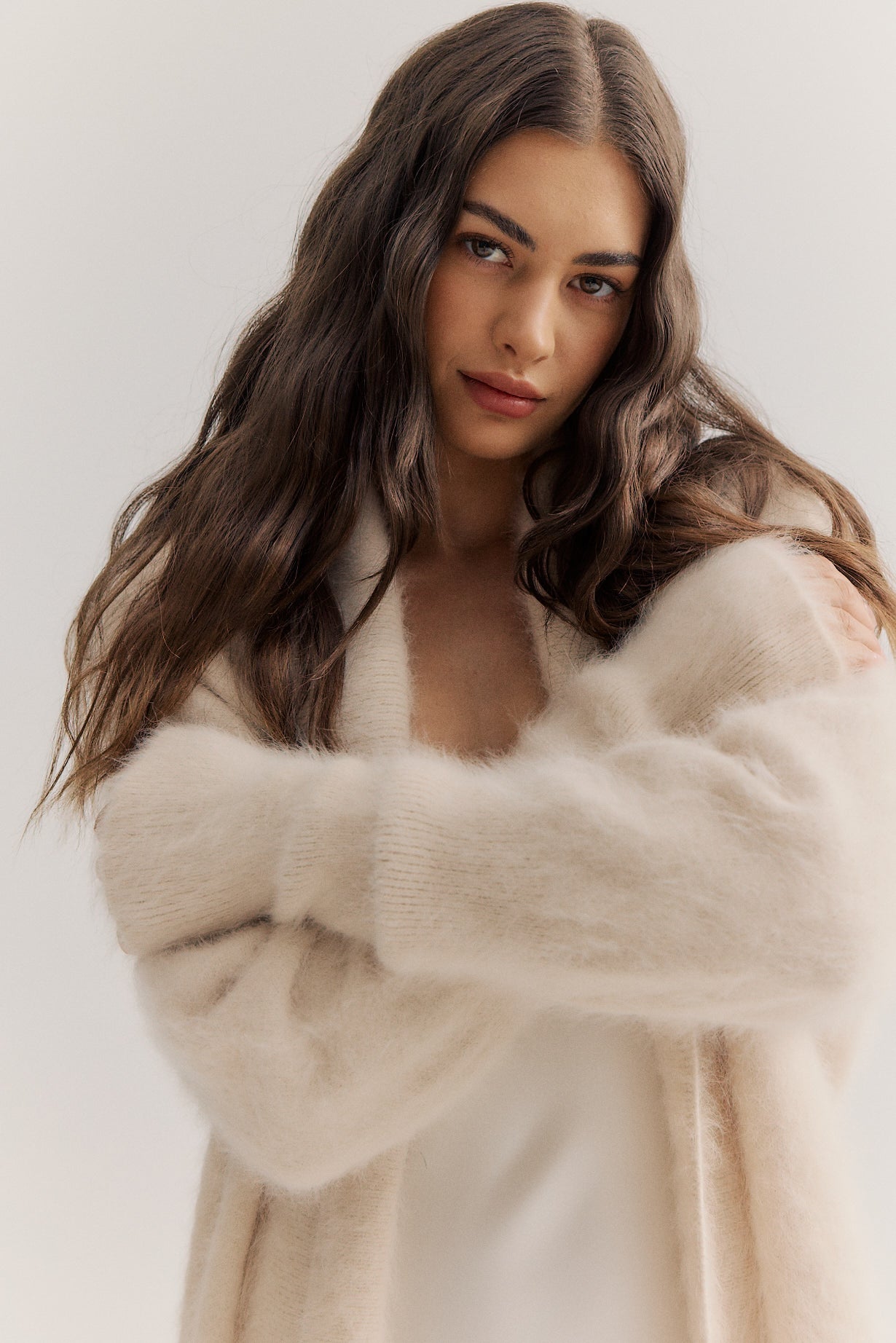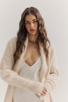 Elevate your winter wardrobe with the luxuriously soft brushed cashmere blend cardigan during the cooler months. Constructed in a relaxed fit with above the knee length. Embrace the warmth and comfort of this cardigan over basics, jeans or take it out with a pair of leather pants.